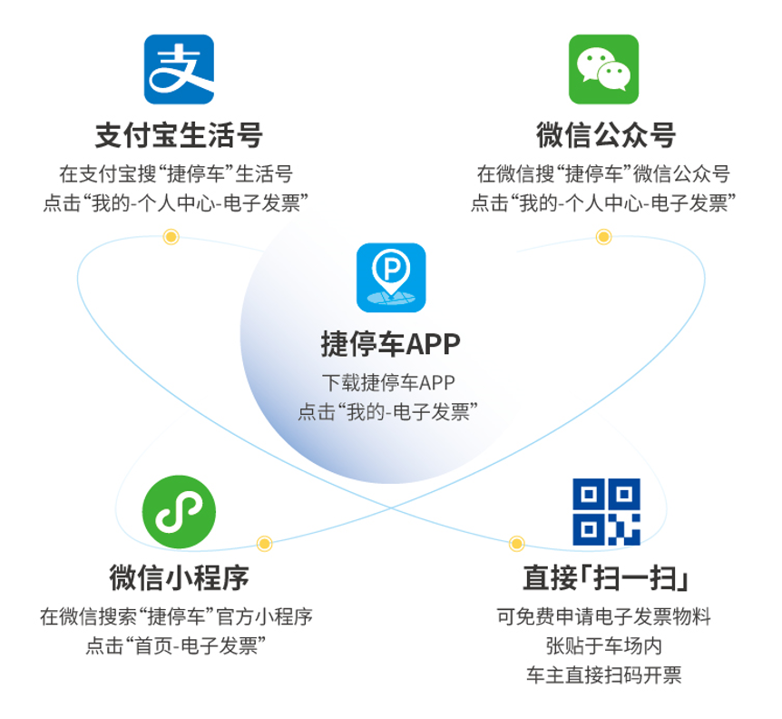 捷停车产品端覆盖APP、微信公众号和小程序、支付宝生活号等,均可快速找到开票入口,也可以为车场提供现场扫码领取电子发票的物料。车主可以多场景、多渠道自助开票,支持临停、月卡、车位优选、充电等多类型服务的开票申请,同个车场产生的多个订单还支持合并开票。方便快捷的电子发票服务已成为车主用户的“心头好”。